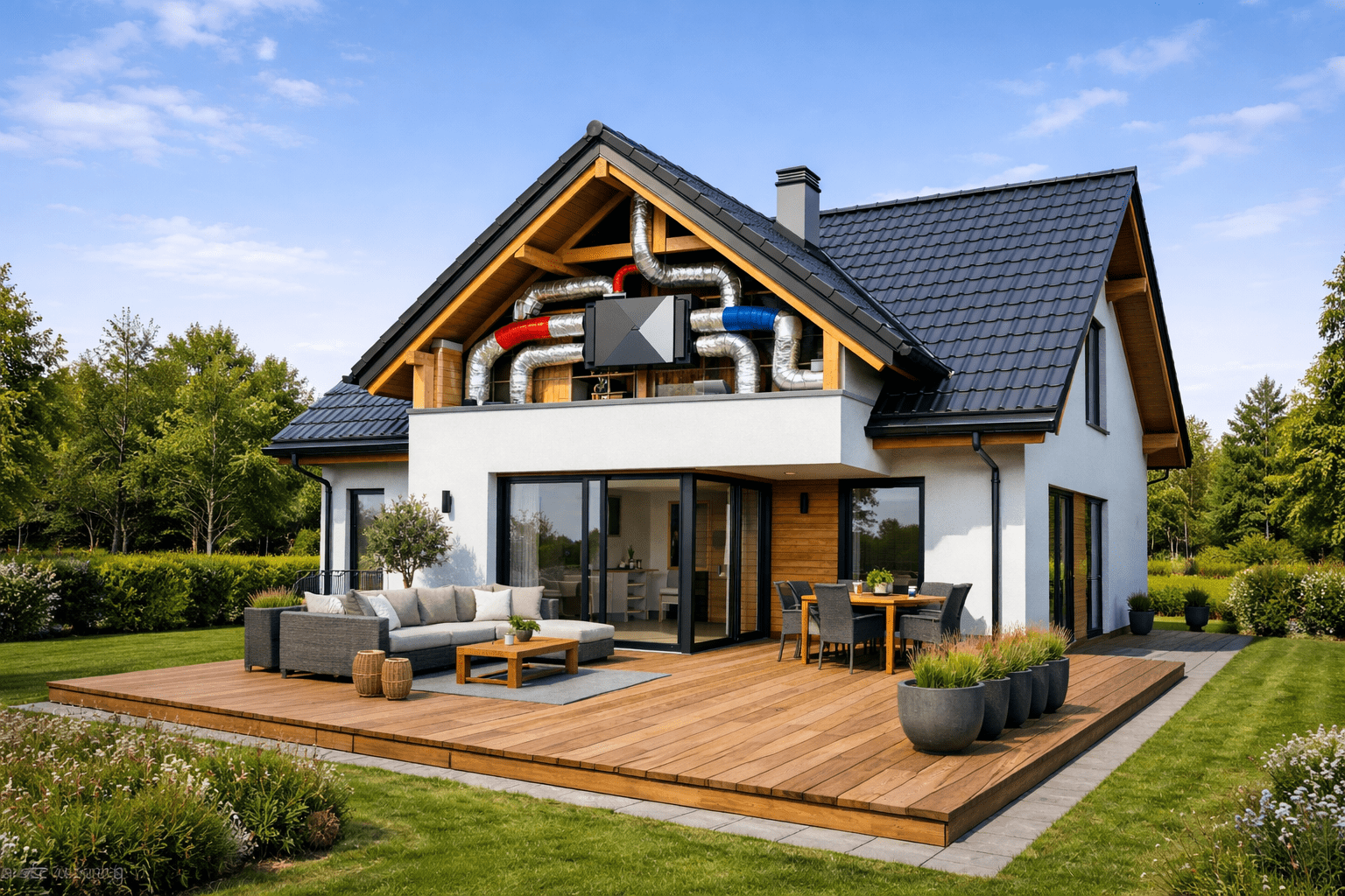 | Komfort i estetyka | Ogrzewanie podłogowe, klimatyzacja, system bezobsługowy |